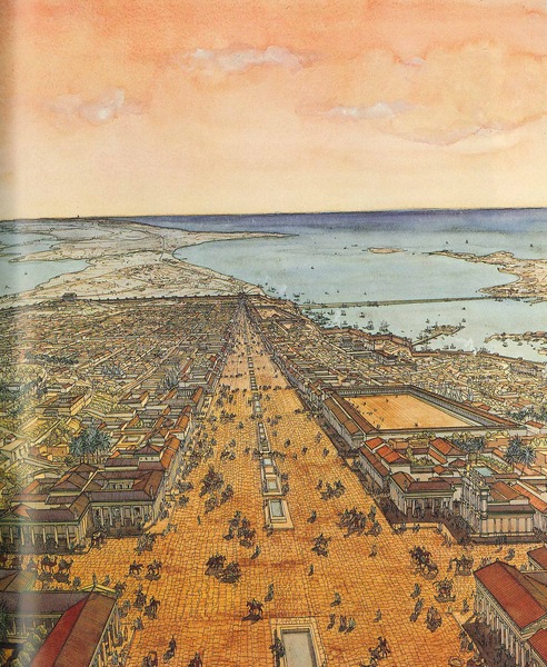 Aerial view of Alexandria’s Canopic Way (Alexandria), looking west by Jean-Claude Golvin (https://jeanclaudegolvin.com/en/gallery/alexandria-alexandria-the-canopic-way-and-the-great-crossroads/)