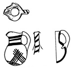 WP cross-line style juglet. Burnished, white painted, with lattices lines painted in brown. Two horizontal parallel bands of black lines below the rim. One horizontal band of black line on the lower part of the neck. Brown horizontal lines on the handle.