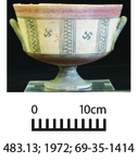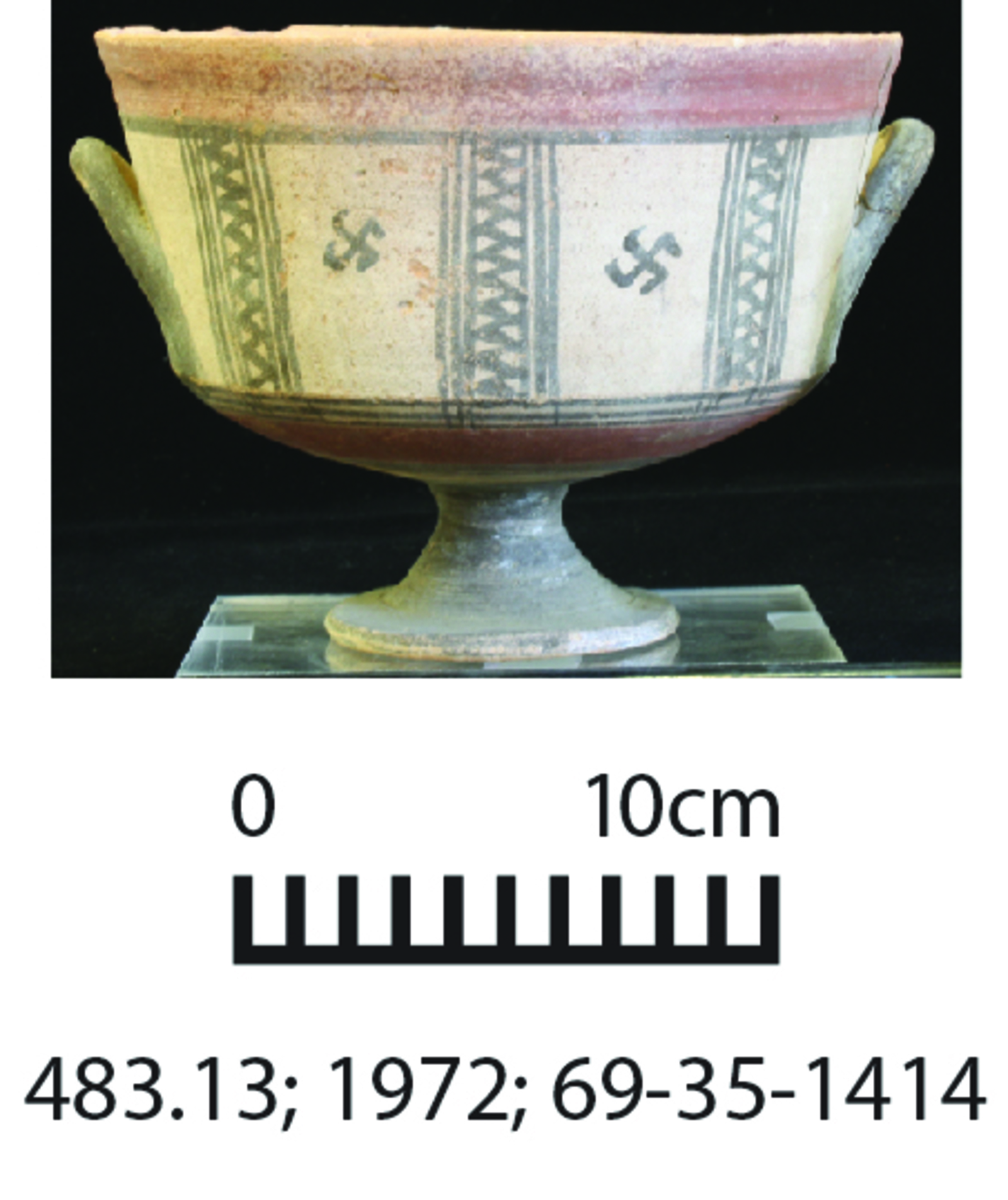 This ware family includes vessels that are wheel made, usually of red or orange fabric but also light ground fabric. All or much of the surface is covered in a red slip, but vessels were not painted. The slip usually fired red-brown to orange but could also turn purple in an oxidizing environment, brown to blackish color in a reduced environment, and mottled red and black in an uneven firing environment. It is possible to confuse fragments of Iron Age Red Slip vessels with the unpainted portions of Cypriot Iron Age Black-on-Red or other Cypriot Iron Age painted wares.